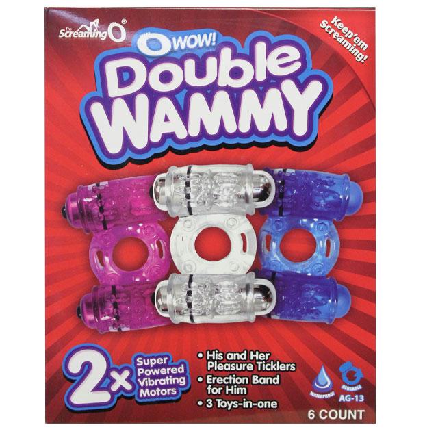 Screaming O: O Wow Double Whammy (6/DP)The OWow Double Whammy is a double-ended super-powered cock-ring with two motors that work together to give couples the dual-action "Whammy Effect". A super-powered bullet vibrator sits at the top for her pleasure with another at the bottom for his naughty bits, and powered together the two stimulators activate intense pleasure ticklers that turn him into a human vibrator! The super-stretchy erection band for him fits all sizes and comfortably offers erection enhancement right where it counts. Looking to switch it up? Take out the Bullets to tease and titillate with the cock-ring on hand for when the timing is right. And put all three back together for the ultimate versatile cock-ring with special features made especially for couples pleasure.Silicone. Waterproof. Phthalates Free. Reusable. Batteries Included. 6 Rings Per Display.