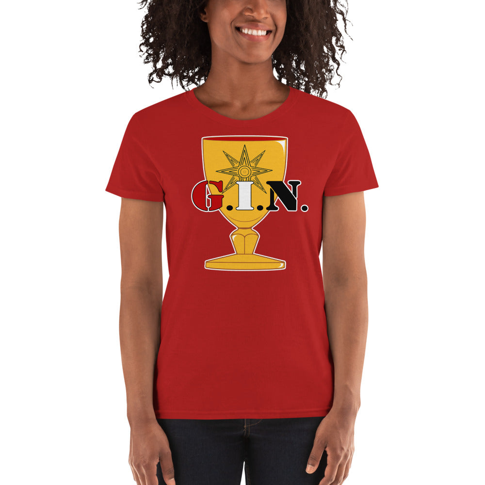 The G.I.N. "Royal Chalice" T-Shirt is a stylish head turner. The shirt is a heavy cotton, classic fit ladies scoop neck t-shirt.
